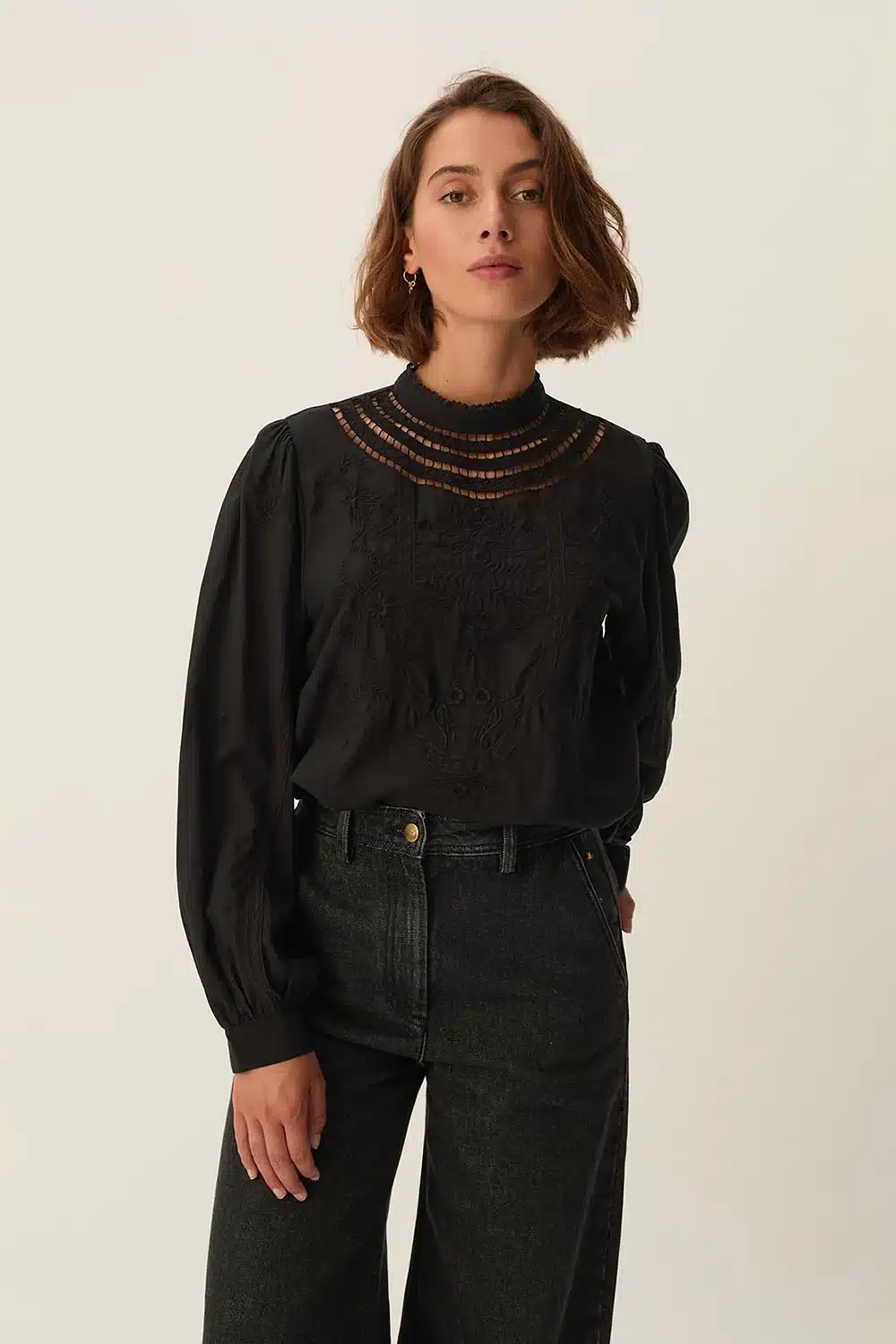 Sens du détail et finitions soignées, la blouse Ethan annonce une saison bohème chic avec son col brodé ajouré et ses broderies florale. Une pièce à porter seule ou sous un gilet sans manches pour une silhouette au charme vintage.