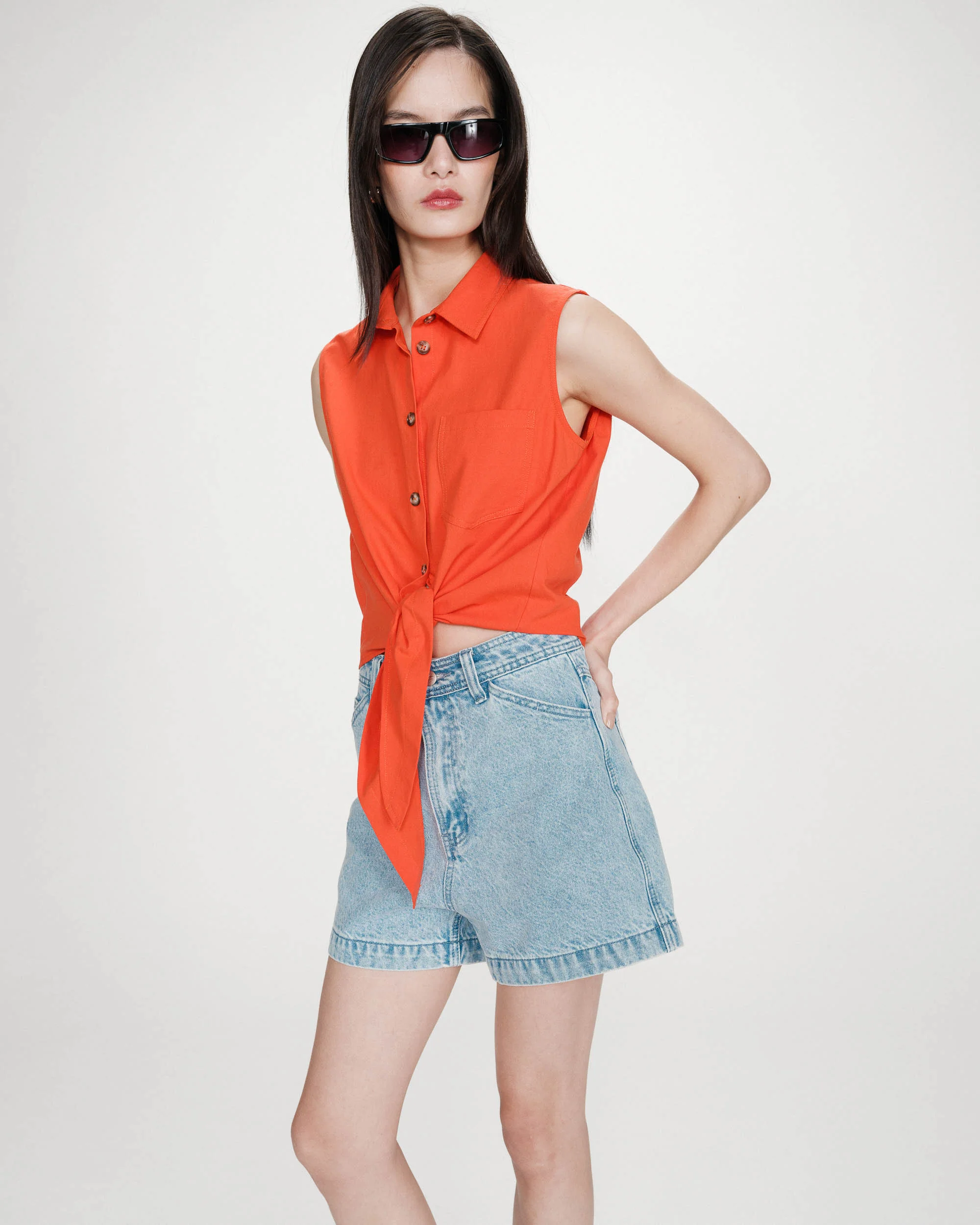 Confectionnée dans un tissu 100 % coton, la chemise sans manches VERO est une pièce légère et confortable, idéale pour la saison. Les éléments classiques du modèle, tels que le col chemise et la coupe droite, s’associent à un lien à nouer sur le devant pour une silhouette moderne et minimaliste. Le modèle possède une patte de boutonnage sur le devant et une poche plaquée sur la poitrine.