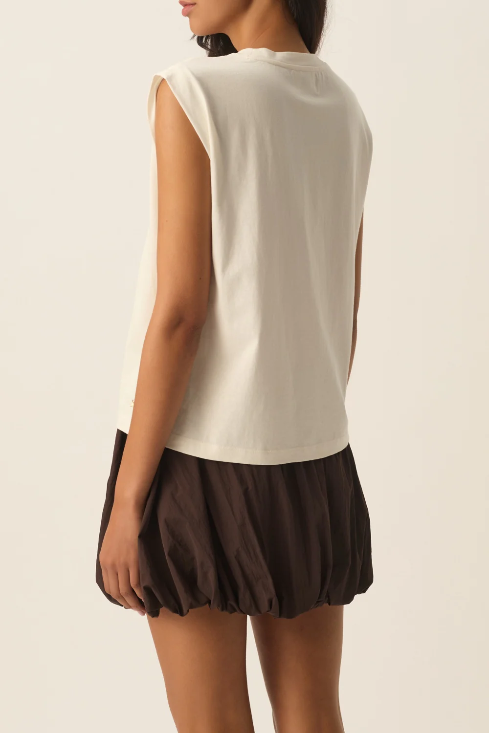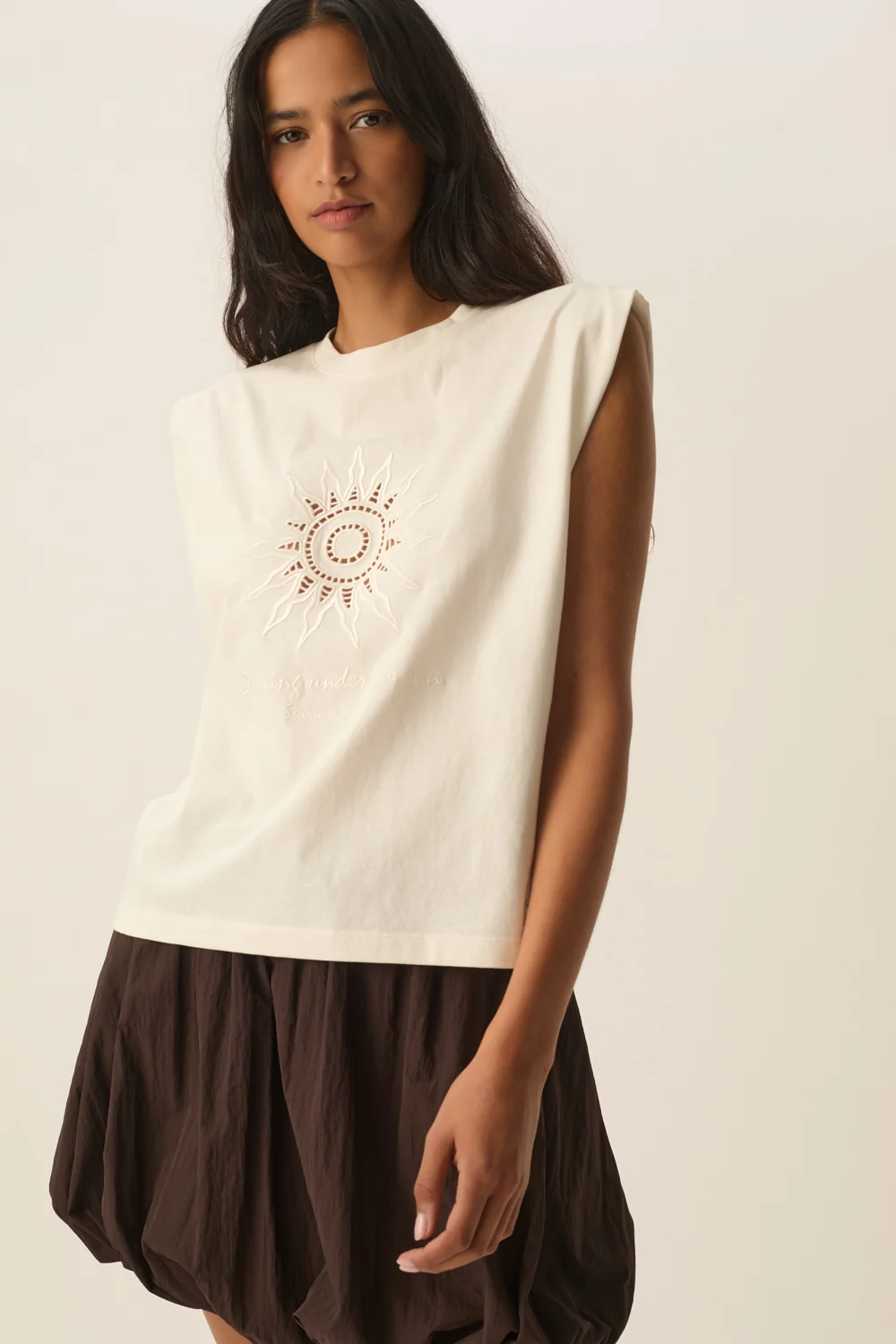 maginé comme un souvenir rapporté de vacances, le débardeur en jersey Yacinthe plonge au coeur de l’été avec élégance et décontraction. Animé d’un soleil ajouré brodé et d’un message ton sur ton, il se portera aussi bien avec une jupe qu’un pantalon fluide.