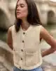 Le gilet Milana se distingue par sa coupe droite sans manches, offrant une silhouette épurée et versatile. Confectionné dans un mélange coton-polyamide, il présente un point délicat à l’aspect tricoté qui apporte texture et légèreté. Son encolure ronde et son boutonnage milieu devant orné de boutons dorés ajoutent une touche de sophistication discrète. Les poches plaquées à l’avant renforcent son côté pratique, faisant de cette pièce un incontournable à porter seul ou en superposition pour enrichir vos looks.