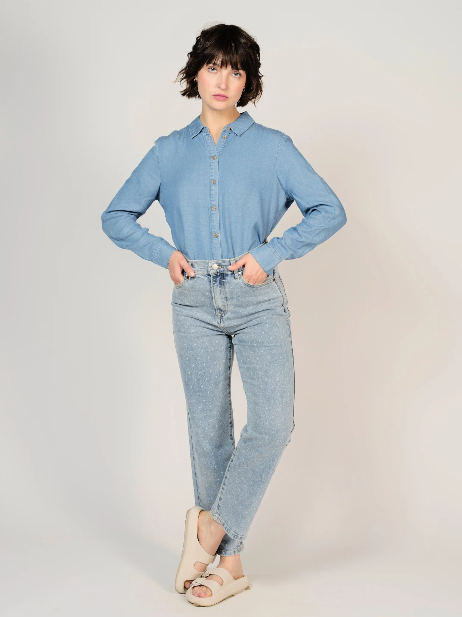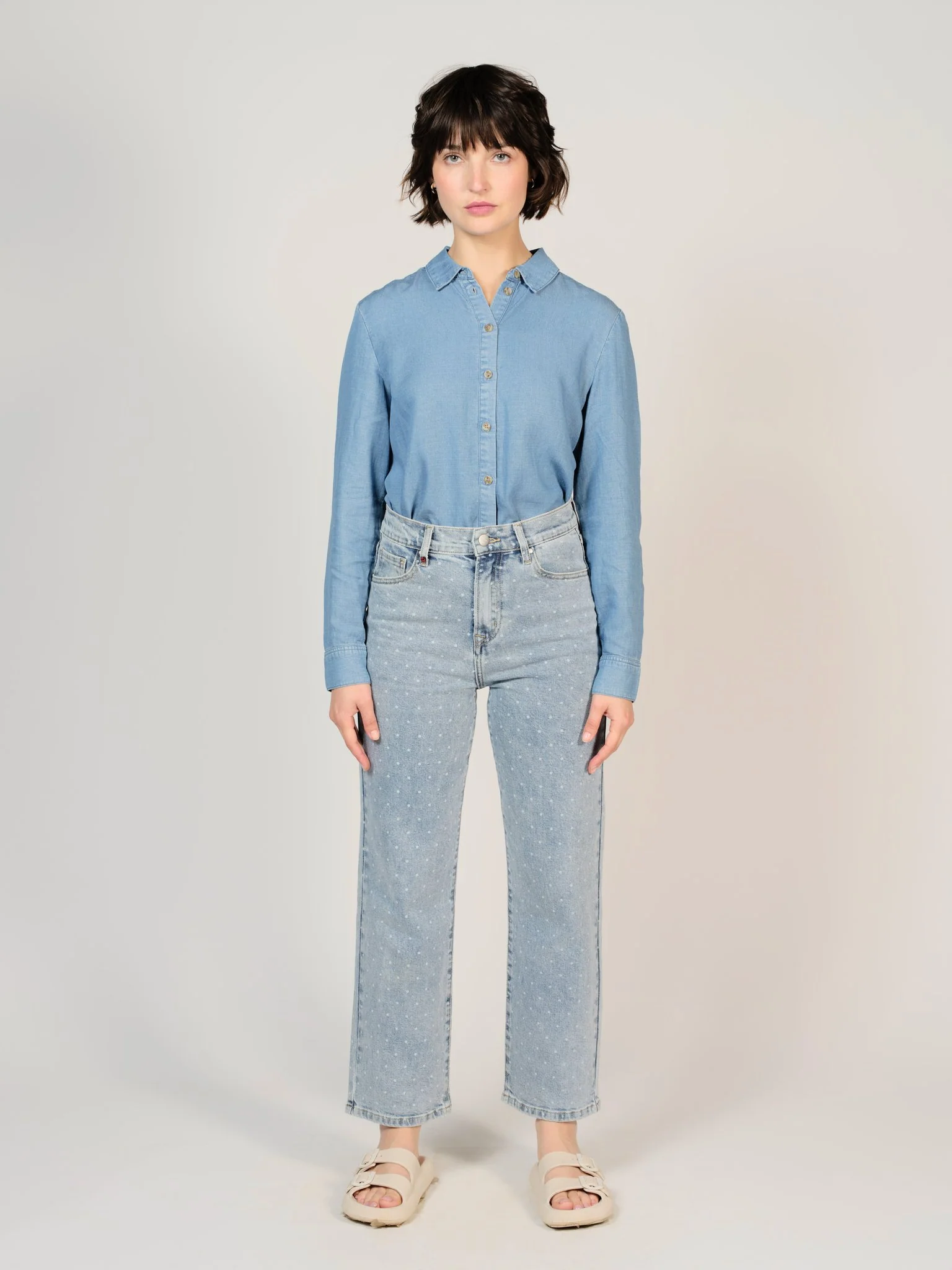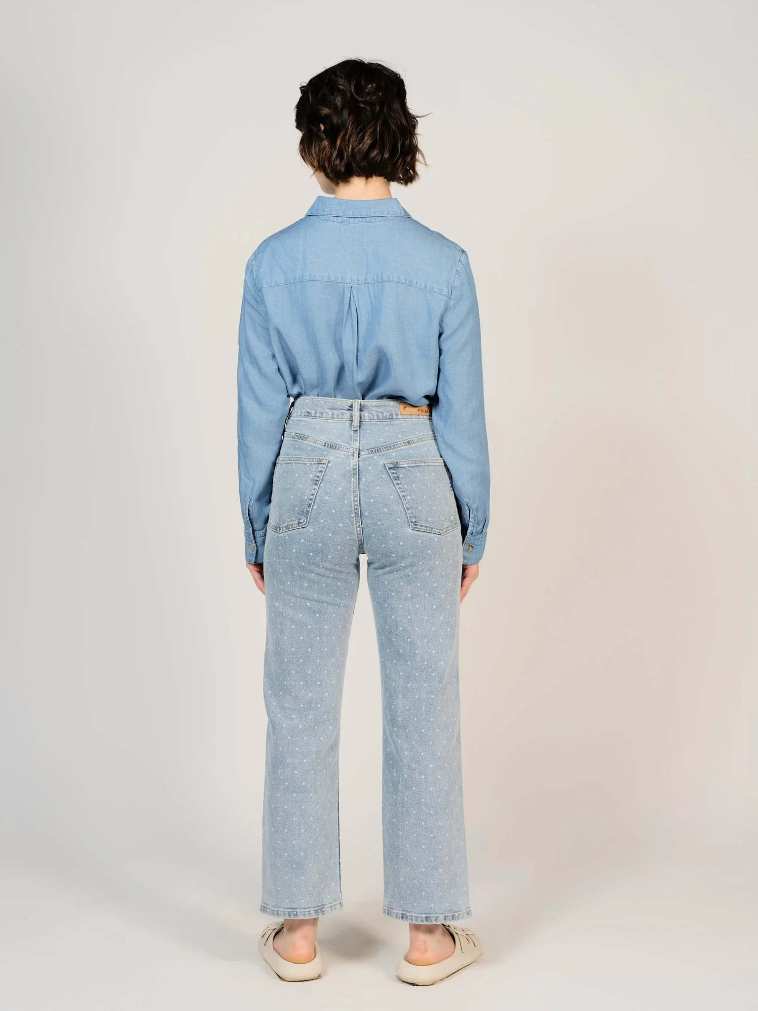 Le POLA POIS est le denim “droit” originel. Cette coupe a un atout, c’est qu’elle peut convenir à toutes les morphologies ! Il est parfait pour les femmes plus grandes. En repliant l’ourlet, on obtient un style cropped tendance.