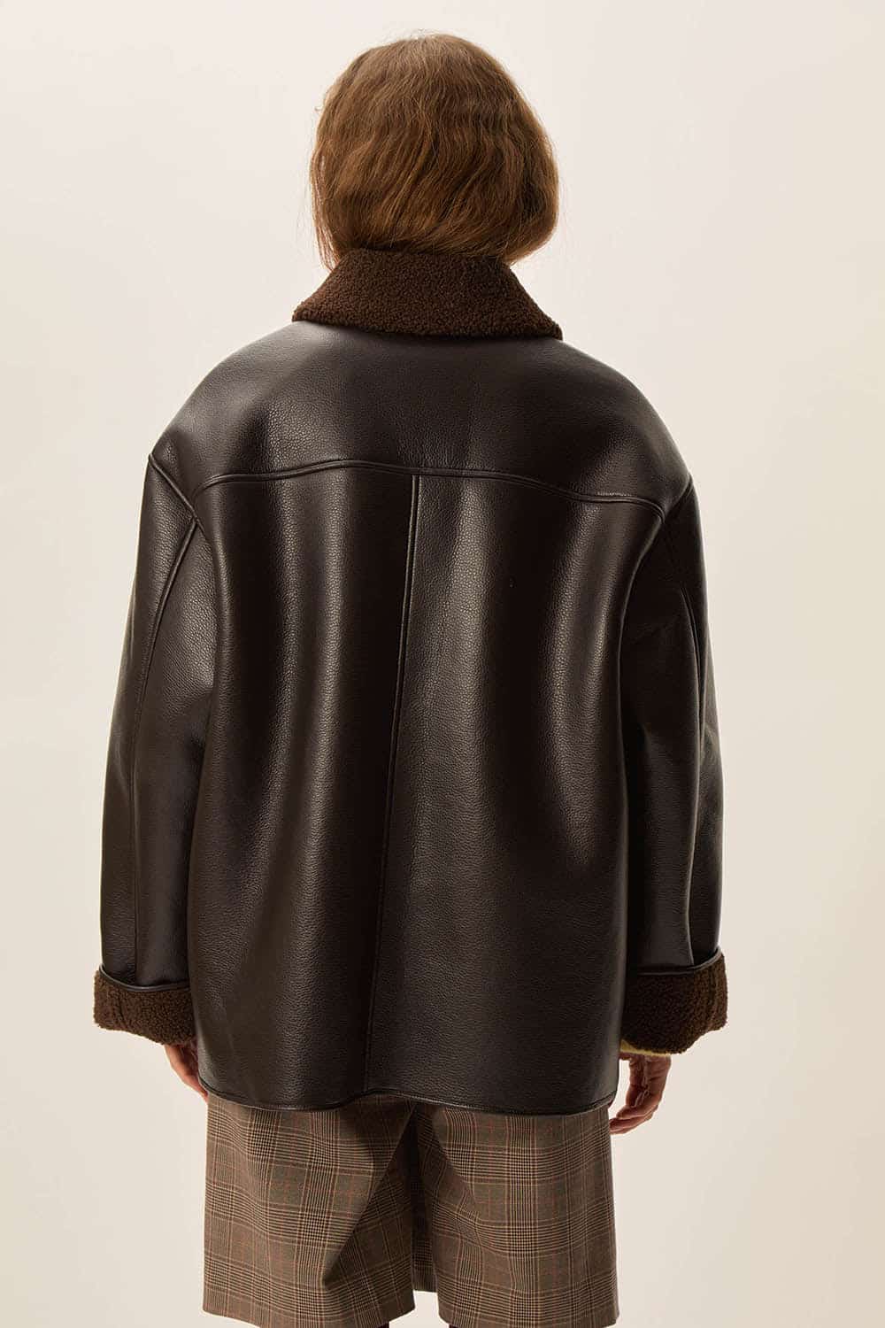 Réinterprétation chic de la veste en peau lainée, le manteau court Yulia affirme son identité. Volume ample, fausse fourrure ton sur ton et manches retroussées, ses détails signent une allure résolument pointue. Une création à enfiler sur vos plus beaux looks de saison.