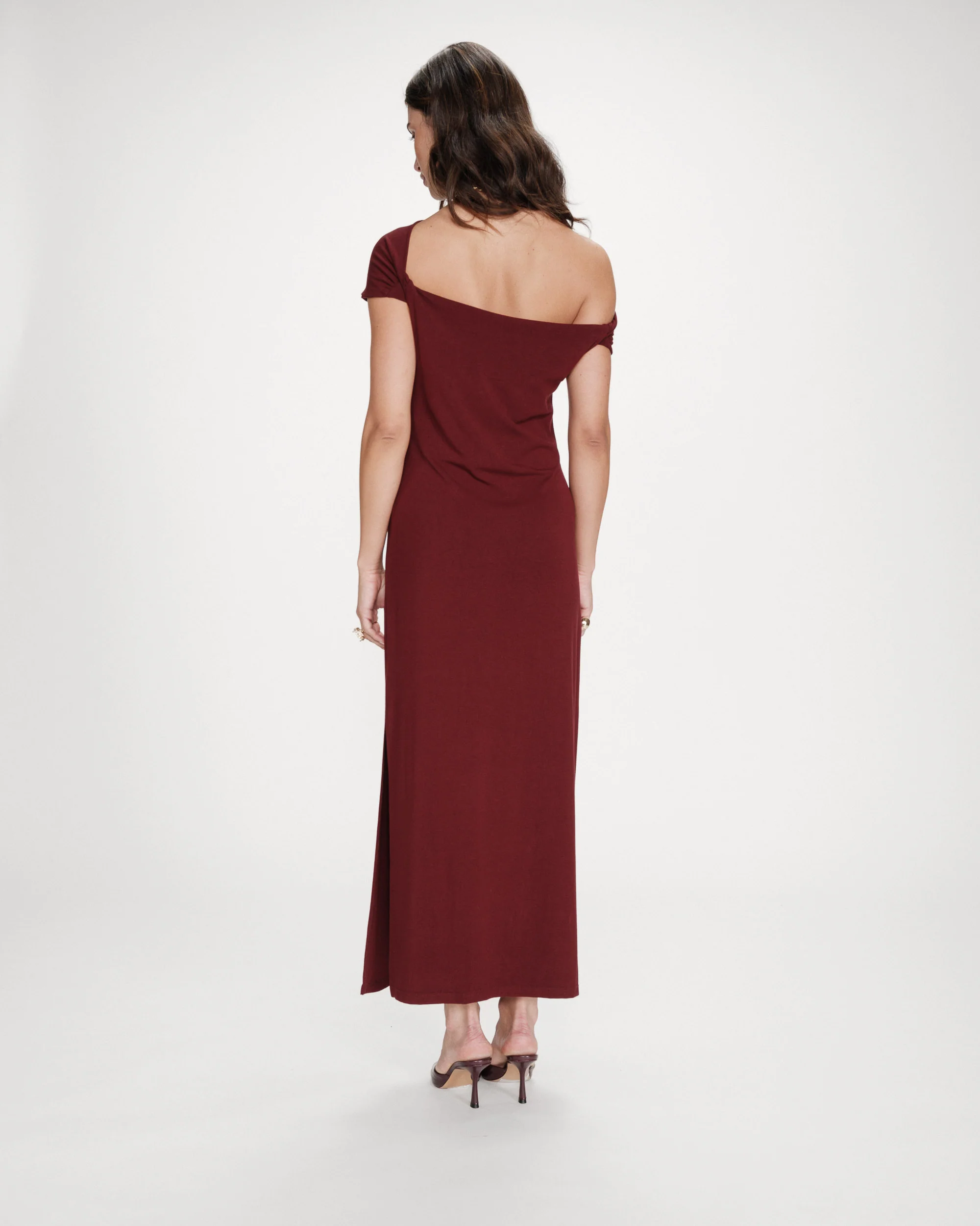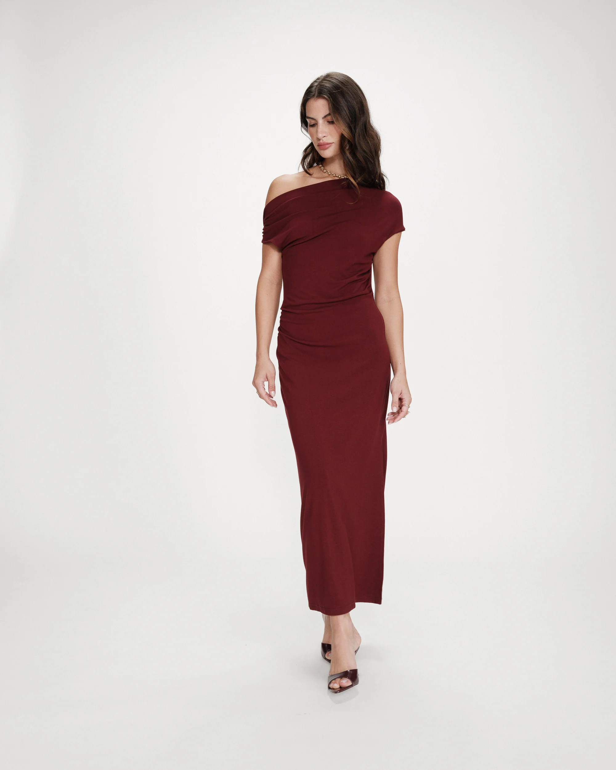 La coupe ajustée de la robe longue VANITY s’associe à des fronces aux épaules et à la taille pour créer un jeu de drapé élégant et féminin. Le modèle, facile et agréable à porter, est confectionné dans un tissu en jersey. La robe drapée VANITY présente une encolure asymétrique qui dévoile délicatement une épaule.