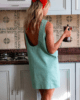 Une robe courte en sergé de coton, dans une teinte vert menthe fraîche qui illumine la matière. Sa coupe droite laisse le corps libre de bouger, tandis que le dos échancré dévoile la peau avec simplicité. La ligne reste nette, moderne, facile à porter du matin au soir.