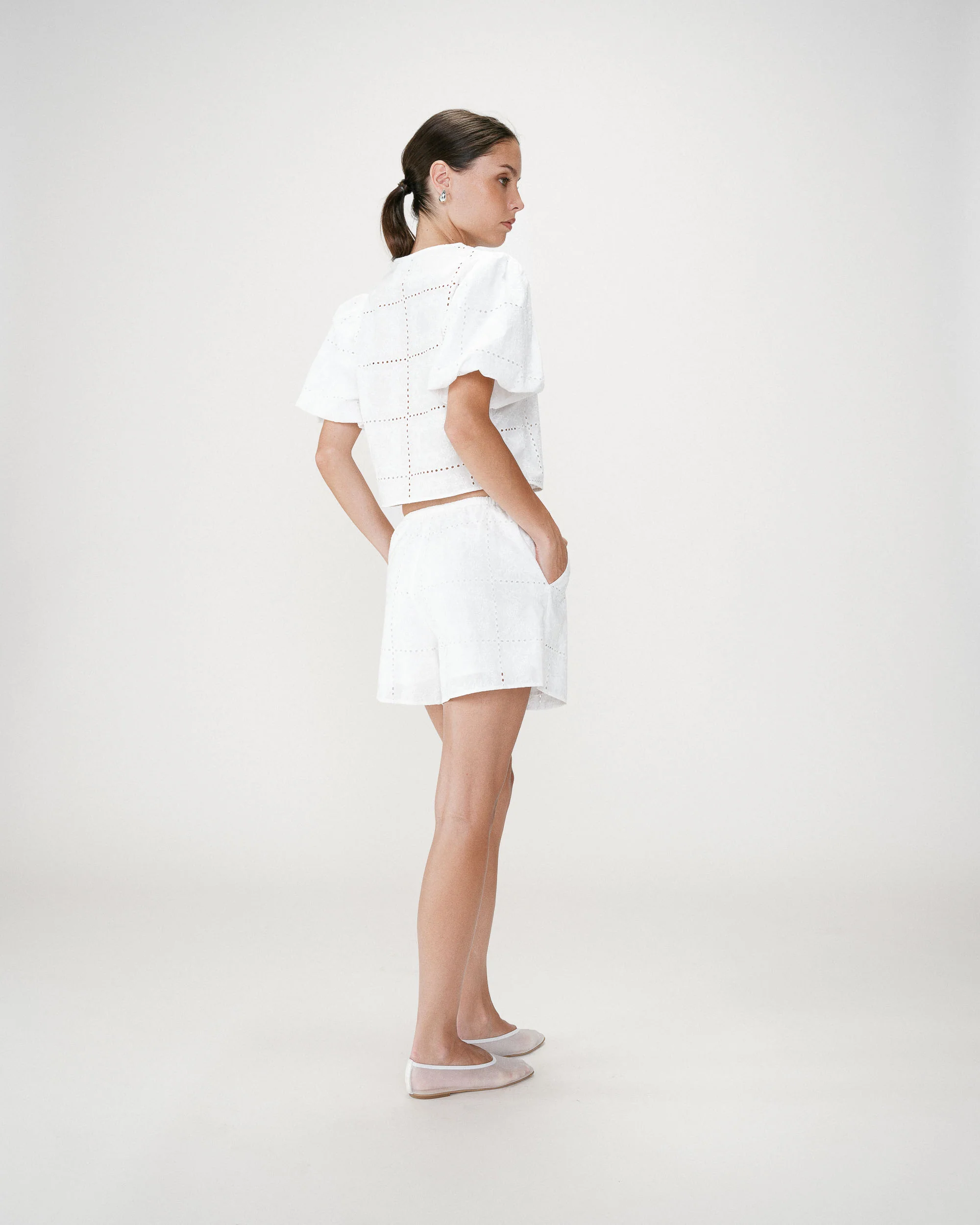 La coupe large du short écru WYLER est rehaussée par un tissu en broderie anglaise et dessine une silhouette délicate et féminine. Le tissu léger s’associe à une taille élastiquée avec cordon de serrage pour proposer une pièce décontractée et confortable.