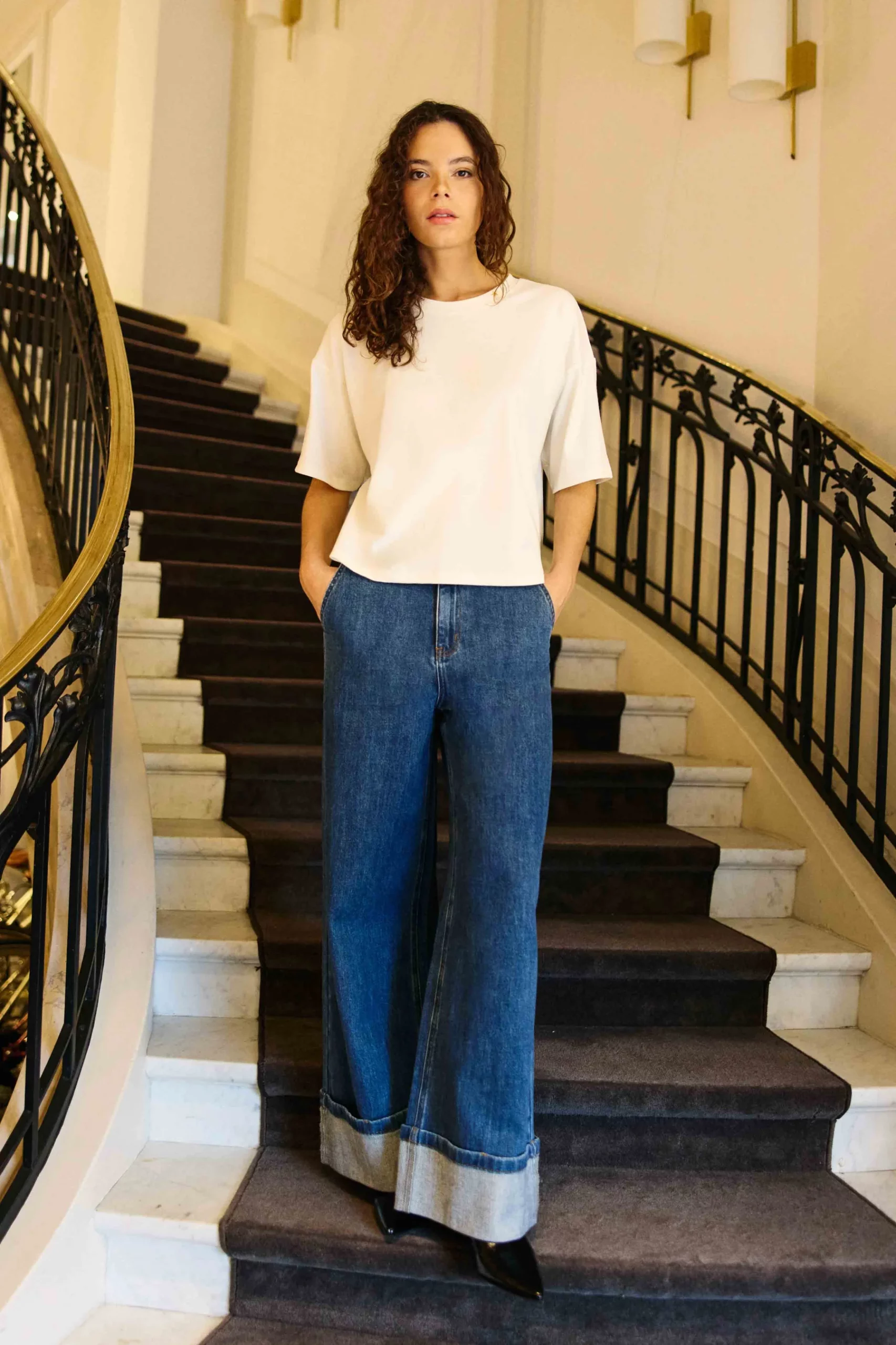 Si vous hésitez entre deux tailles, utilisez notre outil “Bien choisir ma taille”. Le modèle mesure 1m75 et porte une taille 1.