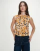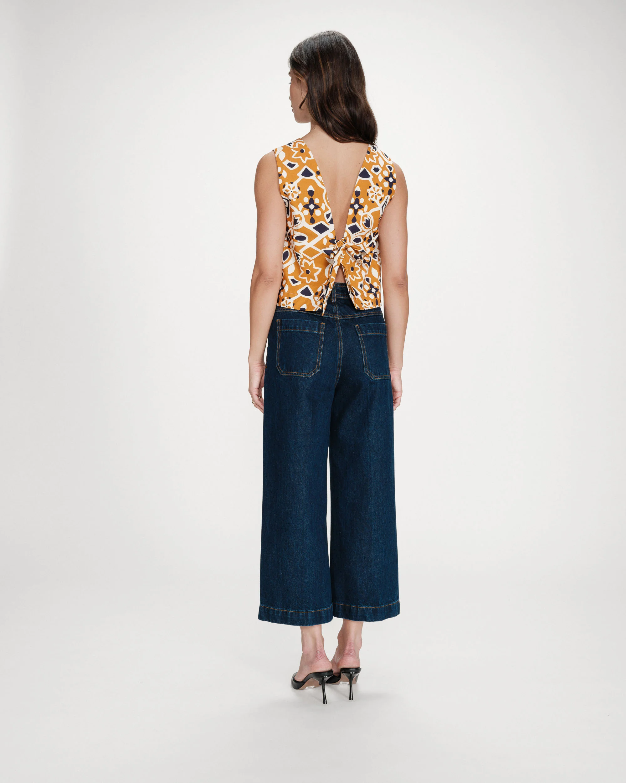La coupe courte et droite du top sans manches VENISE est sublimée par un imprimé graphique aux tons chauds contrastés. Le dos nu se ferme avec un lien à nouer, qui signe une silhouette féminine et sensuelle. Le top imprimé VENISE ajoute à la collection une pièce forte et affirmée.