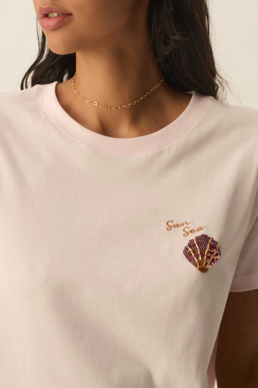 T-shirt manches courtes broderie coquillage coton rose clair