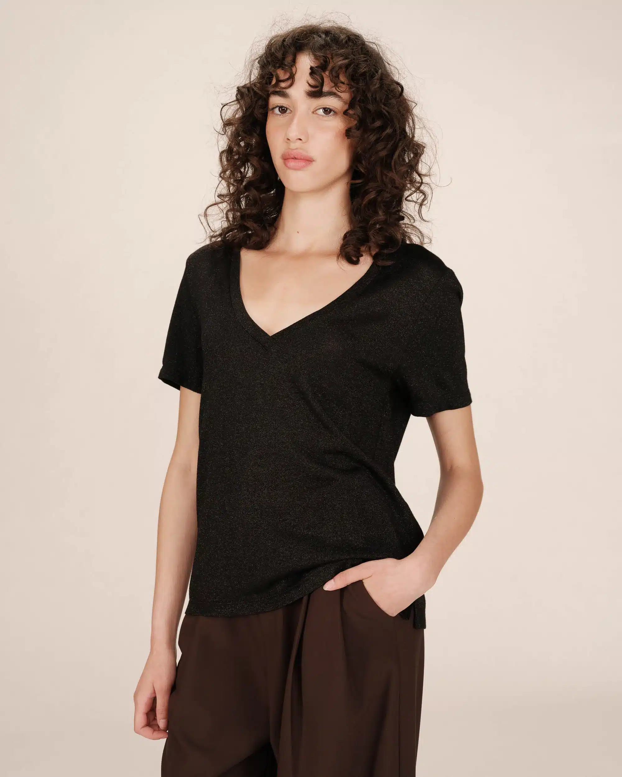 Le top à manches courtes STARDUST est confectionné dans un tissu en lurex et s’intègre facilement au vestiaire du quotidien. L’encolure en V et la coupe droite classique, rehaussée par des fentes sur les côtés, subliment les courbes de chaque femme. Le top en lurex STARDUST est un essentiel a ajouter à sa garde-robe.